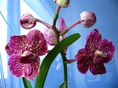 Мне так кажется , что если бы корни висели свободно - цветения бы не было. Цветонос появился через неделю после того, как новые толстые корни упёрлись в стенки горшка и притормозили рост. И ещё я щедро кормила , чередуя 4 вида удобрений, 2 из которых - для цветущих со стимулирующим эффектом. Делала это для того, что бы под новыми листьями (11-12-й) произошла закладка цветоноса, а развитие цветоноса предполагалось через полгода-год. И была просто в шоке, когда увидела его под шестым листом). Ванде предположительно 4 года, по всем интернетовским фото и по увиденным в магазинах реальных - самое раннее цветение у Ванд было при 18 листьях, под 8-10 листом цветонос .Раскидайка писал(а):Юлия, я Вас поздравляю с победой над вандой! Как это удалось?