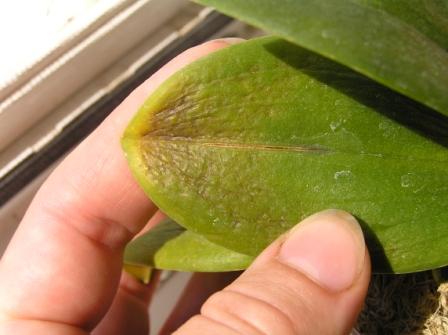 Приехал фаленопсис с Флори,два нижних листа с вмятинами,цвет листьев желтоватый,за неделю желтые листья отвалились.