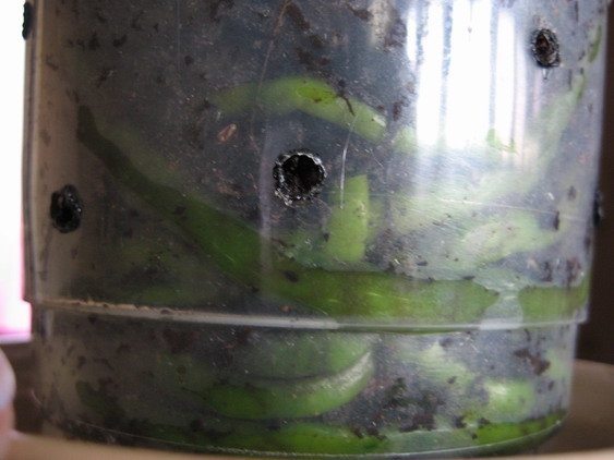 Все те корни, что на фото выше практически засохли. Такое впечатление, что они по-тихоньку отмирают. Субстрат в горшке все еще не просох. Каждое утро замечаю на горшке конденсат. Пересадить пока не выходит - не могу найти в продаже кору. А содраную с деревьев мне должны привезти только на выходных...