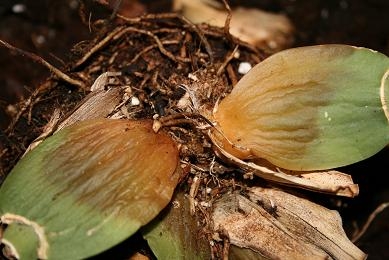 Поражаются корни, нижняя часть растения, туберидий, листья, которые загнивают и отмирают. Ткани размягчаются, становятся коричневыми. Появляется при сильном переувлажнении субстрата и резких колебаниях температуры воздуха. Подвержены Cymbidium, Paphiopedilum, Vanda, Miltonia, Odontonia.