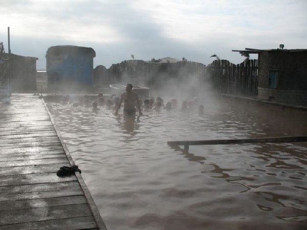 Показываю горячий гейзер, вода в нем кирпично-красная, содержит железо и еще чего-то из нефти, говорят, очень полено от всего (или для всего)