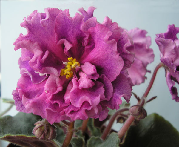 Розетка как розетка. А цветы твердые на ощупь, распускаются долго. Тоесть стоят такие себе подсолнухи и постепенно становятся более похожими на фиалку. Цветоносы очень крепкие, поэтому цветы отсыхают, жухнут по лепестку. В первом цветении размер не большой, по описанию — огромный. Может потом покажет себя. Мне понравился очень цвет и форма цветка.