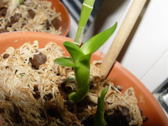 Жанн, это еще не листья, пока он вырастет, певые два листочка - в будущем будут покрывать бульбу - высохнут. Считаются только те листья, которые идут из верхушки псевдобульбы.