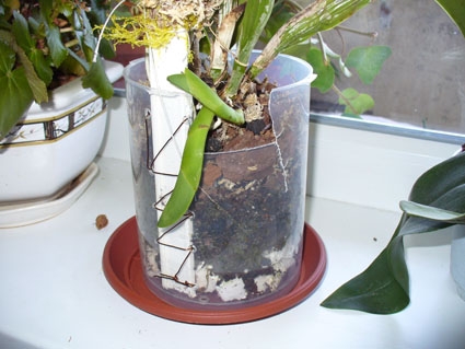 Если к горшку прикрепить досточку, а на нее закрепить сфагнум, кокосовое волокно и уже к этой "мохнатой" стойке, проволокой подтянуть растюху. На мой взгляд, и держаться лучше будет, и дополнительная влага корешкам. Что скажите?