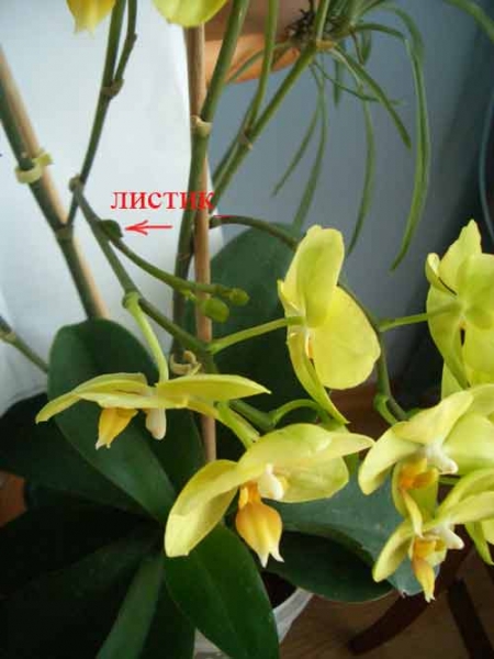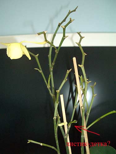Рада! Пожертвовать такими пышными ветвистыми цветоносами? Ну уж нет! Скорее этим рогатеньким пожертвую! Тем более, что буквально за ночь ОНО выросло, но за счет стебля и на сейчас под нижним "рогом" (листиком) виден уже достаточно длинный (1см) кругленький стебель (5мм в диаметре). Возможно, действительно - цветонос? Посмотрим!