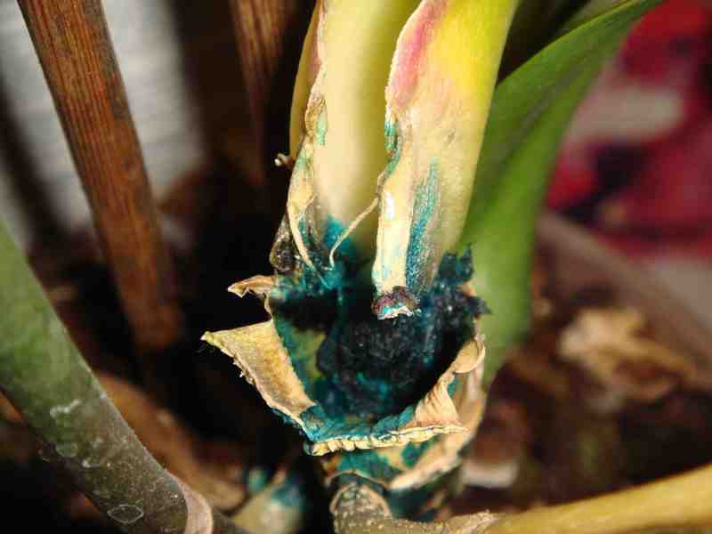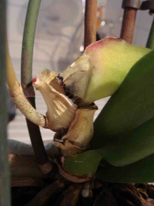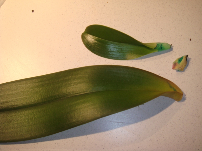 Сегодня утром осматривала свои Орхидейки и дотронувшись к одной из них обвалился кусочек – два тугих зелёненьких листика