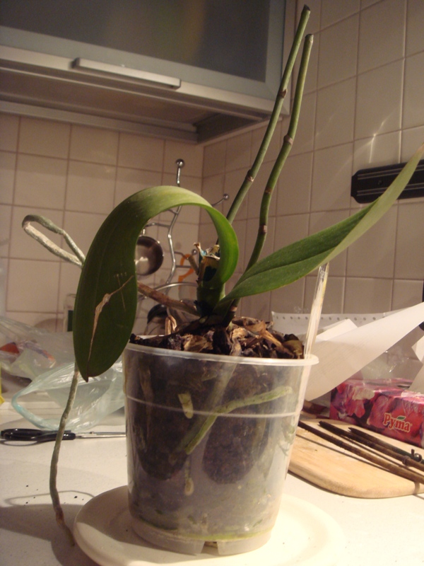 Его ведь ещё можно спасти? Осталось два здоровых листа, три!!! цветоноса (правда, два из них подсыхают - один проклюнулся в декабре – 10-12 см и подсыхает сейчас, и ещё один с цветочками подсыхает, что делать?) и много-много зелёненьких жирненьких корней… Я осмотрела часть от которой отвалился кусочек, она темноватая, но вроде бы не мокрая, возможно, подсохла… НО ТУТ я совершила, видимо, ошибку…
