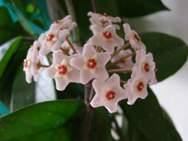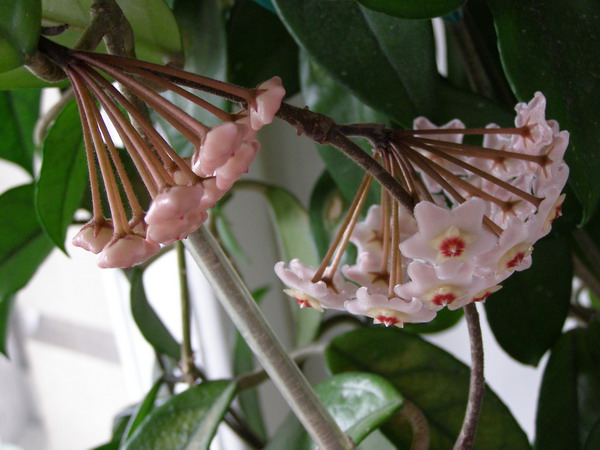Мне нравится эта хойя. Она не из быстрорастущих, а листья на солнышке обретают бордовую кайму. И цветет регулярно. Но до сих пор не больше одного цветоноса за раз.