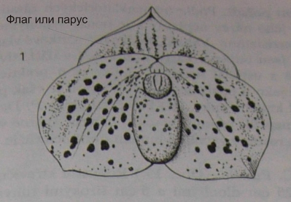 Поскольку подсемейство Cypripedilinae (в народе они известны как "Башмачки") очень рано отделились от семейства Орхидных, о в отличие от большинства орхидей явлвются наземными растениями, не эпифитами, то это не могло не сказаться на строении цветка. У Башмачков две сепалии сросшиеся и направлены вверх. Этот лепесток в литературе имеет специальное название "Флаг" или "Парус". Он резко выделяется величиной и яркой окраской и служит для привлечения насекомых.