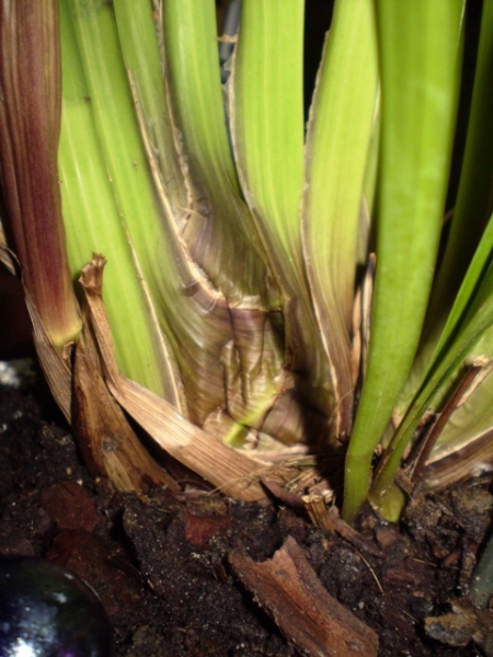 Каждый молодой рост на этом растении обычно даёт один цветонос и два новых роста. Это выросло за два года из купленных четырёх бульб, две уже тогда были старые, две молодые дали четыре бульбы, на них четыре цветоноса и восемь новых бульб, а эти восемь дали шесть цветоносов и ожидаю не меньше двенадцати новых ростов весной. Так что на вашем резать росты мне кажется не надо.