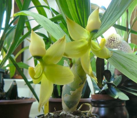 Посадка в небольшой горшок глиняный, субстрат - кора со мхом. Время роста - обильный полив, удобрения. Зима - небольшое понижение температуры и почти прекратила полив. Цветонос вылез зимой. После появления нового роста возобновляем полив и так по кругу.