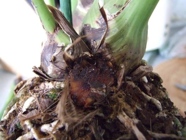 Вынимайте из горшка и отделяйте бульбу. Резать по ризоме до чистого среза-обработать любым фунгицидом или антибиотиком.