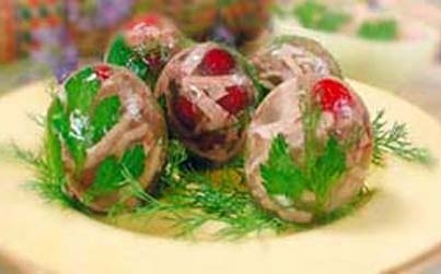 В каждую скорлупку налить крепкого бульона - 1-2 чайных ложки, и подождать чтобы бульон застыл. Бульон лучше всего готовить из ножек, ушей и прочего, что именуется мясом 3 сорта. Тогда в него желатин можно не добавлять. Если готовите бульон из хорошего мяса, желатин добавить надо, но только растворять его не в воде, а в охлажденном бульоне. Затем, когда желатин в бульоне набухнет, осторожно подогреть, не доводя до кипения. Еще одно необходимое условие - бульон должен быть прозрачный иначе заливное не будет выглядеть красиво. Если у вас получился не прозрачный бульон, приготовьте следующую смесь - 1 тертую морковь смешайте с 1 белком и опустите в кастрюлю с кипящим бульоном. Через некоторое время на бульоне появится шапка, которую надо снять. Затем процедить бульон через двойной слой марли.