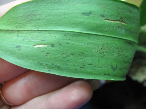 Поражаются цветки. Появляются мелкие бурые пятнышки, потом гниль распространяются на весь цветок. Избыточная влажность воздуха и низкая температура способствуют. Поражаются преимущественно белые цветки каттлеи, фаленопсиса, цимбидиума.