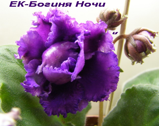 Сенполия ЕК-Богиня Ночи -Очень крупные махровые бахромчатые светло-фиолетовые цветы-розы образуют обильные гроздья над стандартной зелёной розеткой. Розовидная форма цветка.