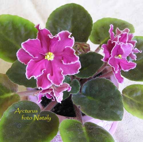 Крупная полумахровая красная звезда с белой каймой и волнистыми лепестками. Средне-зеленые простые листья.