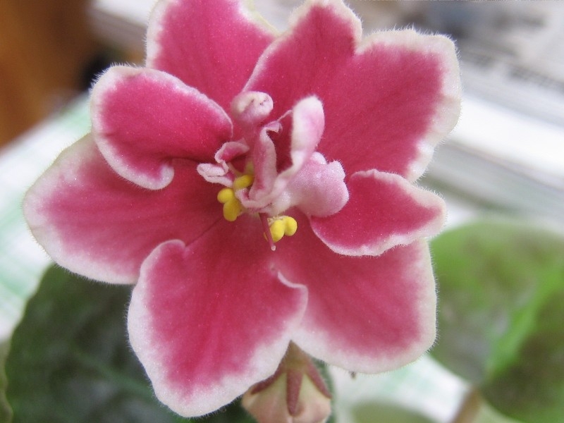 Крупная полумахровая красная звезда с белой каймой и волнистыми лепестками. Средне-зеленые простые листья.