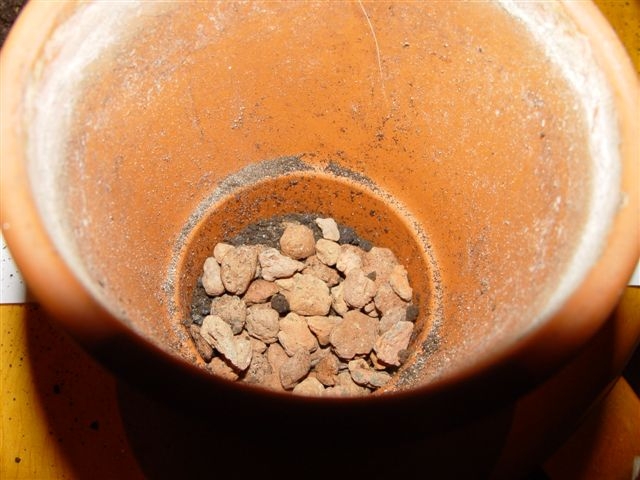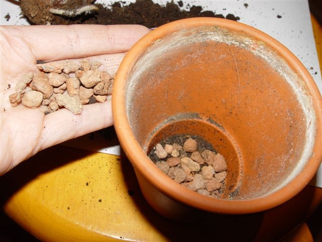 На дно горшочка насыпаем слой керамзита.
