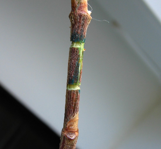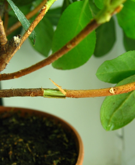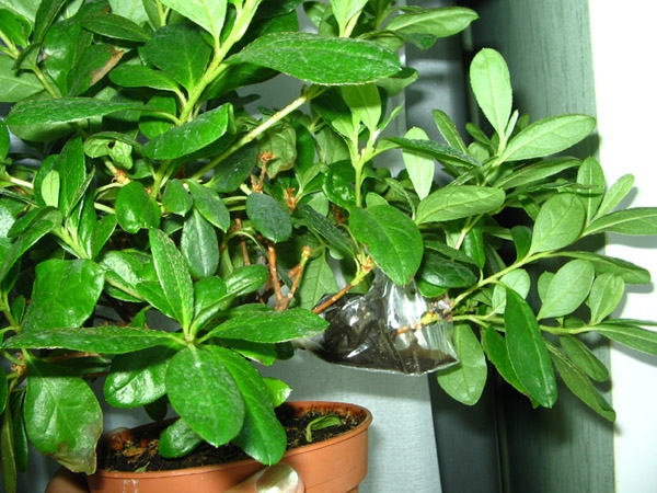 Смысл способа состоит в том, что у выбранной веточки срезается лезвием кольцо коры шириной около 1 см, надевается полиэтиленовый пакет, привязанный сверху и снизу разреза и наполненный землёй (сфагнумом, перлитом, любой другой смесью). Субстрат внутри пакета должен быть всегда влажный.