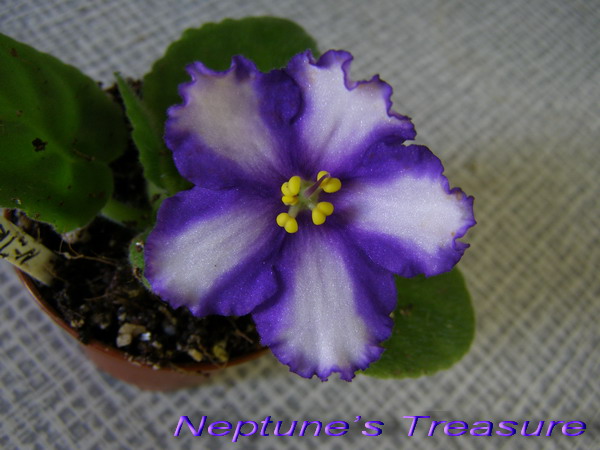 Rob's Kid Wheezy (R. Robinson)- Semidouble white pansy/irregular dark purple-blue edge. Medium green, pointed. Semiminiature