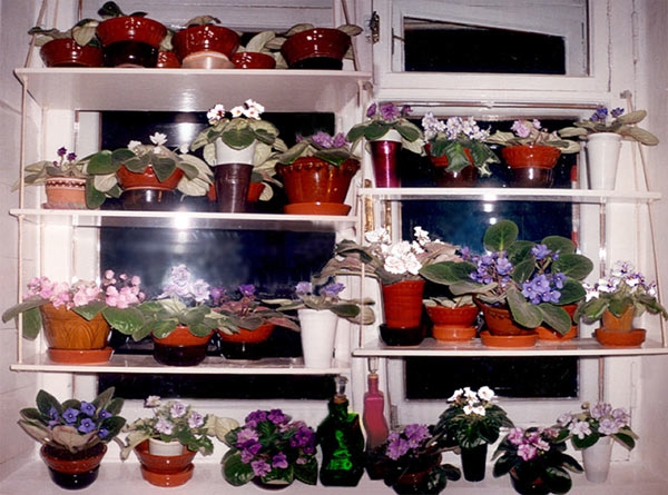 У меня окна выходят на южную сторону и стелажи сделаны размером на всю глухую сторону окна. Мы пересмотрели кучу вариантов и остановились на каркасе из ДСП и и полочках из 6 мм стекла. Солнца хватает и нам в комнате, и цветам