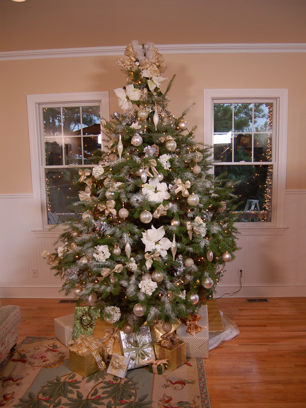 Украшена игрушками разной величины и формы, дополнена цветочными мотивами, основного белого цвета и золотом.