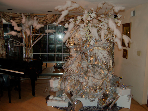 Ветви этого чрезмерно высокого дерева покрыты снежными брызгами, украшены разнородным материалом - от зеркальных украшений до веток крылатого тростника.
