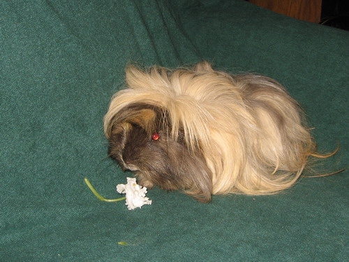 А мой Пэпа надменный стиляга. Линяет жутко. На пузе подержишь, затем надо щеточкой шерсть убирать. Пэпа у нас перуанская длинношерстная или ангорская морская свинка. Расчесываем, колтуны на попе срезаю ножницами. Расчесываю аккуратно, но он все равно пищит. Зато потом, как Йокширский терьер. Я его называю- Йокширский терьер для бедных