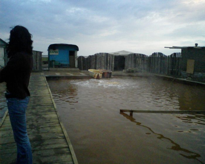 Показываю горячий гейзер, вода в нем кирпично-красная, содержит железо и еще чего-то из нефти, говорят, очень полено от всего (или для всего)