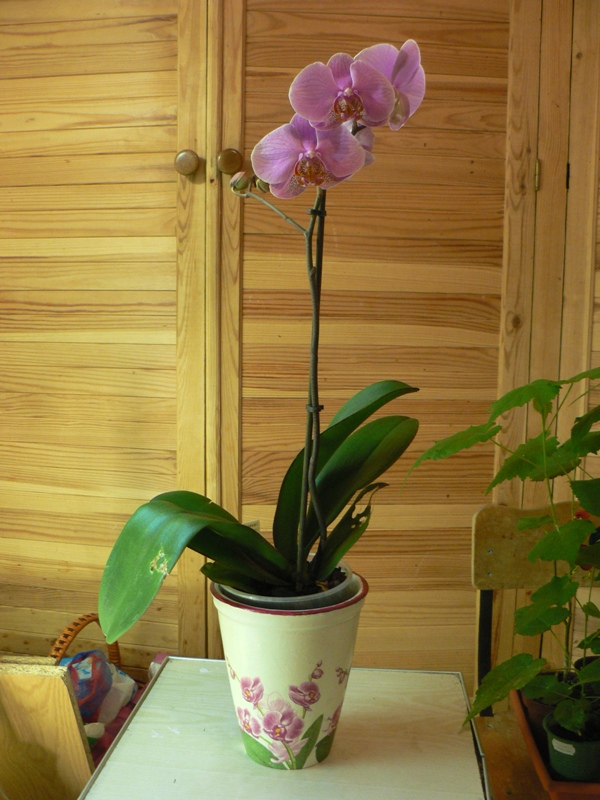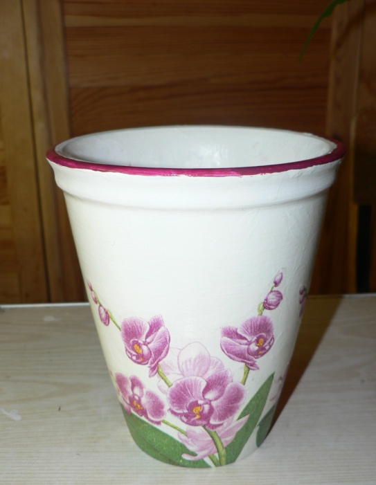 Горшок я делала так же, только мотив орхидеи я вырезала из салфетки (на коробке полностью салфетку использовала) и плюс ободок дорисовала по краю горшка.