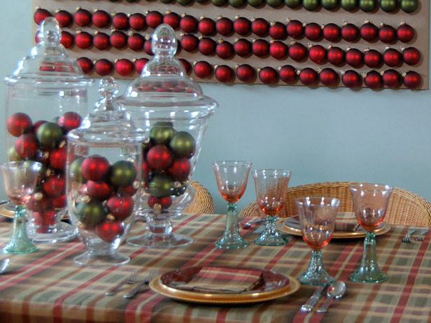 раскладываем по столу праздничные шары, наполняем ими стеклянные емкости, их же рядами вешаем на стену