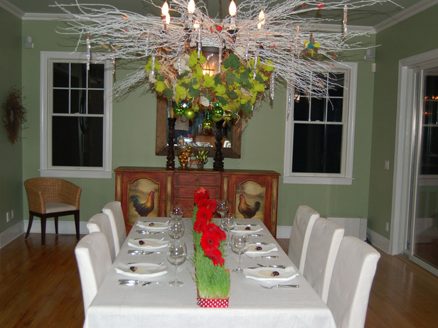 А это декор "с-ног-на-голову", люстра обильно украшена зимним материалом, а сам стол летним. Очень стильно и особенно подходит тем, кто предпочитает елку вверх ногами.