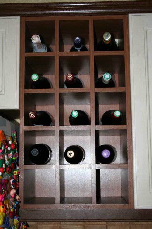 Уже вижу проблемку, поскольку основные накапливаемые напитки это вина и виски. А поскольку они требуют разные условия хранения, т.е. вино нужно хранить лежа, а глубина "дырки" похоже меньше высоты бутылки ( хотя сегодня измеряю линейкой). Есть конечно компромисный вариант отвести весь этот бар под виски, а вина хранить в каком-нибудь другом месте.