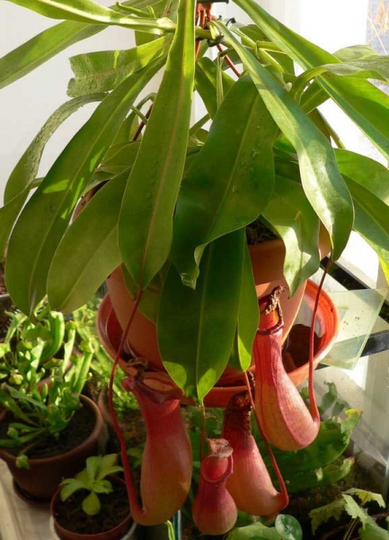 И еще хотелось бы добавить к сказанному! Если в кувшинчиках будет убывать влага то необходимо подливать мягкую воду.Желательно отстоять и из опыта по аквариумным рыбам лучшее средство смягчить воду добавить в бутьль с водой где будите отстаивить воду,немного торфа,он и смягчит ее.Во всяком случае мои Непентесы по этому поводу нежалуються.И последнее к глубокой осени всеже кувшины имеют свойство вять.