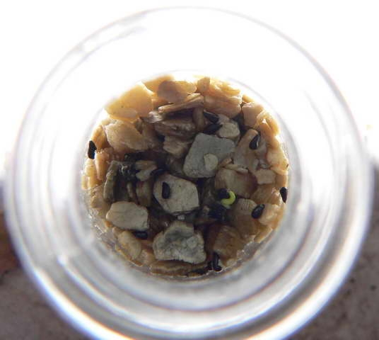 Посадил я эти семена в пенициллиновые флакончики заполненные вермикулитом, смоченным дистиллированной водой, до состояния влажности, без свободной воды. Положил туда семена, и закрыл пробкой. Прошло 30дней. Сегодня заметил появление проростка, и 2-х проклюнувшихся семян. Вот фотография.