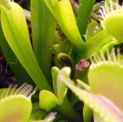 Вот уже достаточно подросшая двойная ловушка у мухоловки. Как раскроется полностью, выложу новую фотку. Есть у меня один куст, на котором, а также его деленках, довольно регулярно образуются сдвоенные ловушки, до 2-х раз за год.