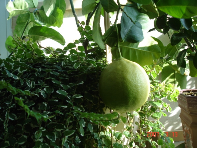 Вот мой лимончик. Растет кустом. Сорт неизвестен. Это второй плод за этот год. Размером он со средний магазинный лимон, только круглый. Первый лимон, съеденный нами в начале февраля, был в два раза больше, весил около 300г. К сожалению, фото не сохранилось.