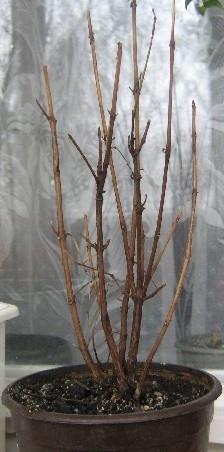 А вот, кстати, обнаружила фотку "скелетика" одной из мелкоцветок. Я ее купила на выставке в августе на Спивочем Поле. Такая классная была. Но сразу же стала обсыпаться у меня дома. Да еще на ней оказалась белокрылка и стая комариков. Помучалась я с ней - опрыскивала, пересаживала, удобряла... Она очень быстро осыпалась, потом вдруг стала новую листву на некоторых веточках наращиват. Потом - опять резко все обсыпалось. Я обрезала ветви и оставила на зиму рядом с другими фуксиями стоять. Но, так ни одного нового листика весной от нее и не дождалась. В итоге - при расчистке мест для фиалок, отправился сей скелет на свалку!