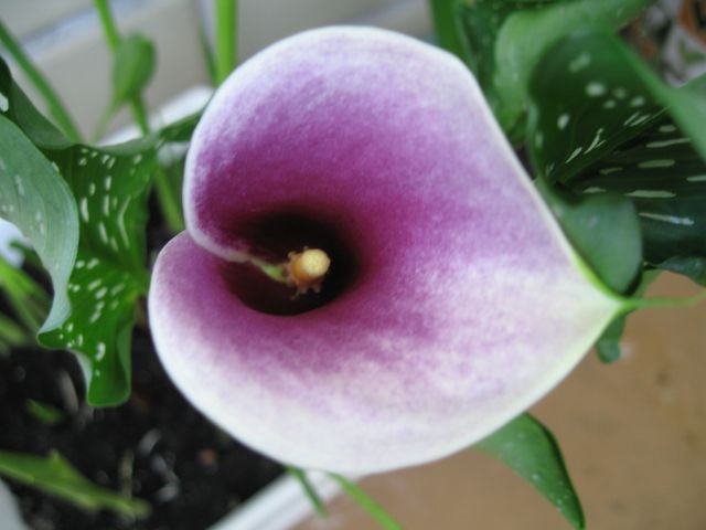 2) Калла белая была куплена прошлой весной двумя листиками - цвела все прошлое лето, это прервое цветение в этом году. Фиолетовая - Пикассо куплена в этом году в Украфлоре клубеньком. ТОже первое цветение. У меня сегодня уже распустилась прошлогодняя желтая - очень бледненькая. Ботвы много у всех