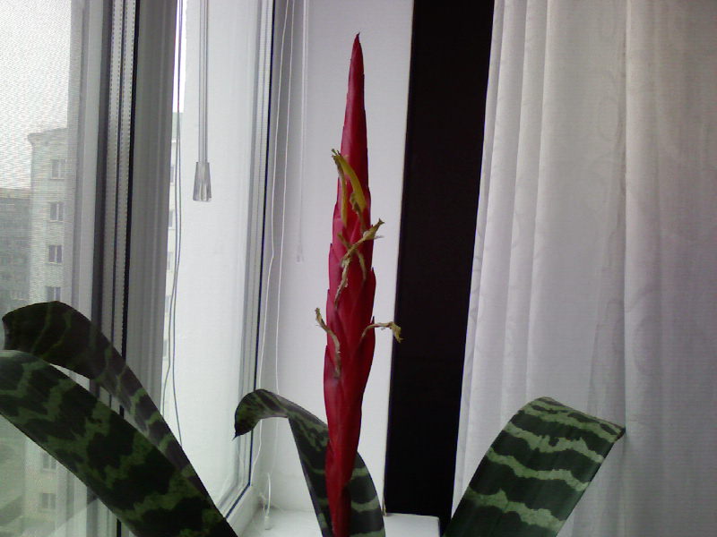 Цветочки держаться недолго, они вылазят по одному, потом засыхают, но даже сухими их трудно вытащить, надо обрезать, наверное. Стрелка эта держалась месяца три, наверное, не засекала, потом я ее срезала под корень. А вообще первая стрелка у меня не цвела. Недавно видела в магазине вриезию с такими "цветами".
