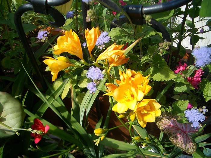 В средине июня на балконе дебри. Цветут фрезии и агератум