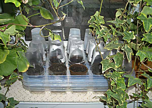 В торфяные стаканчики я бросила по зернышку гвоздики. На картинке была очень красивая: махровая, темная-темная с белой камой по лепесткам. Но взошли пока очень плохо. И росточки какие-то хиленькие, как ниточки