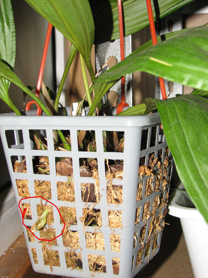 Вот такая корзина, сквозь прутья которой виден цветонос. Второй цветонос оплетает бульбы.