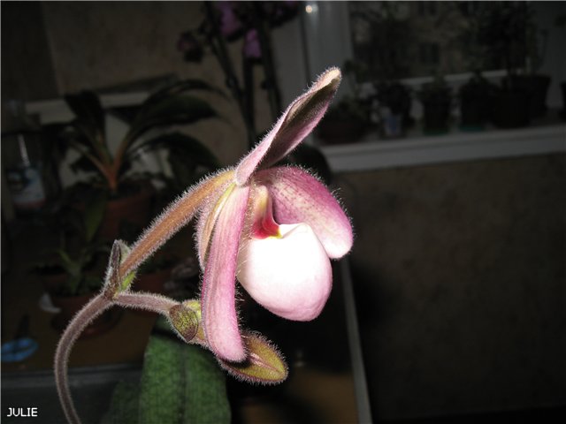 Это мой первый башмак (гибрид на Деленати). В профиль цветок очень похож на лопоухого ослика.
