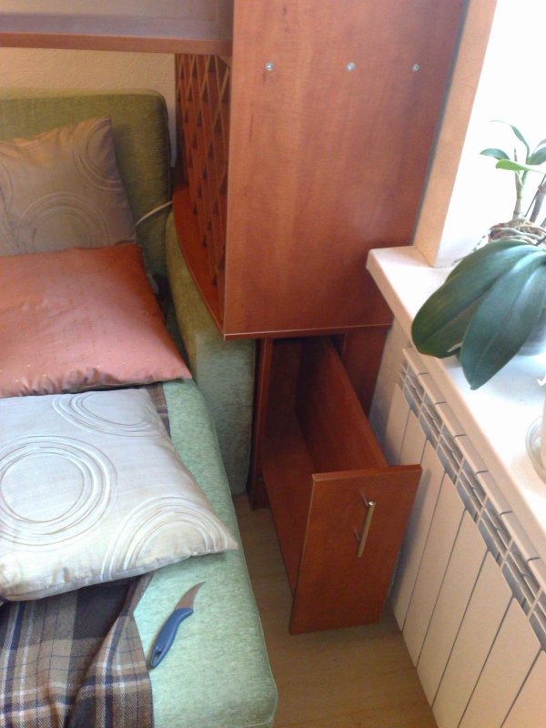 И еще родилась мысль использовать для дела самое нижнее пространство, которое спрятано за диваном. Там возможно использовать такую выезжающую полку, какие обычно встраивают на кухнях для разной бытовой химии, не знаю как это называется, но ровно такой модуль можно у нас сделать, выезжать он будет вбок, и там ровно становится ряд бутылок.
