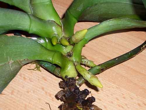 Подобным образом нарастил корешки другой фалик и когда они достигли размера 5-6-8-10см и начали ветвиться и упираться в дно горшка, я постепенно перевела его на обычный орхидный грунт. Сейчас уже конечно не поковыряешь в земле. Приходится по другим признакам судить о самочувствии растения
