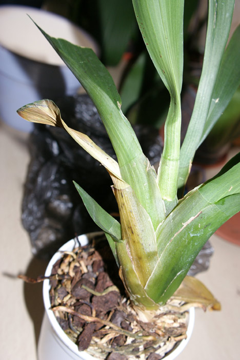 Произошло это следующим образом: когда перебирала ее голую корневую, не все пообрезала (думала, что части корней живые), да и бульбы без листьев тоже надо было удалить (а я оставила). Вообщем моя распрекрасная катлейка с бутоном начала активно растить корешки, а потом после очередного опрыскивания решила интенсивно загибаться. За две недели остался один лист в бутылке и то весь в черных пятнах, даже если гниль остановлена, нет уверенности, что он пустит корни((( $:020 .