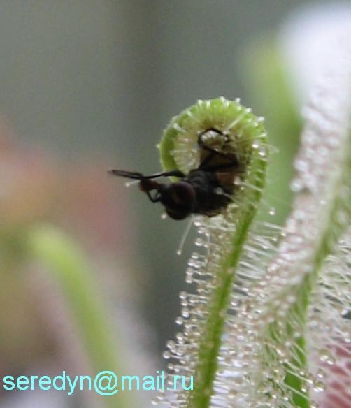 Фот ещё несколько кровожадных фото. Главные участники: Муха комнатная и Drosera capensis var. alba...и я, в роли "подглядывающего"