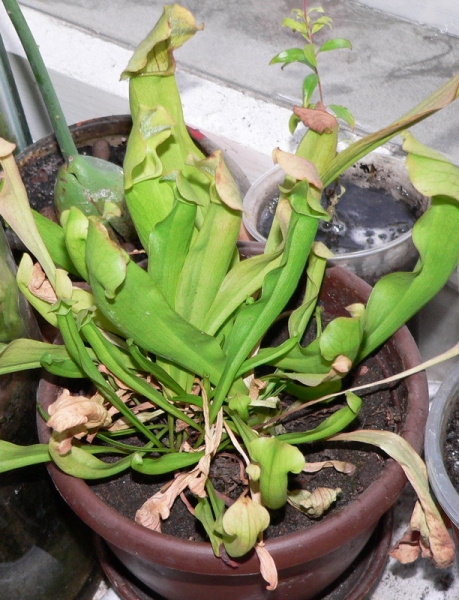 На фотографии моя сарацения, точно вид назвать не могу, но из самых простых. Бывает обычная (как моя), flava и alba, т.е. с желтыми и белыми окончаниями трубок-листьев.