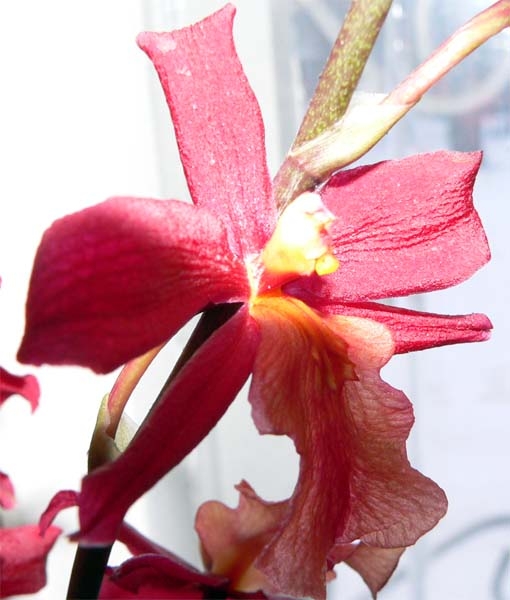 Моя, предположительно, Colmonara Burrageara Stefan Isler, без документов, но внешне 100% соответсвующая названию орхидея, цветет буйным цветом. Решил скрестить ее с попавшим в мои руки цветком, тоже вероятно гибридного, Цимбидиума, диаметр цветка которого достигает 8 см.